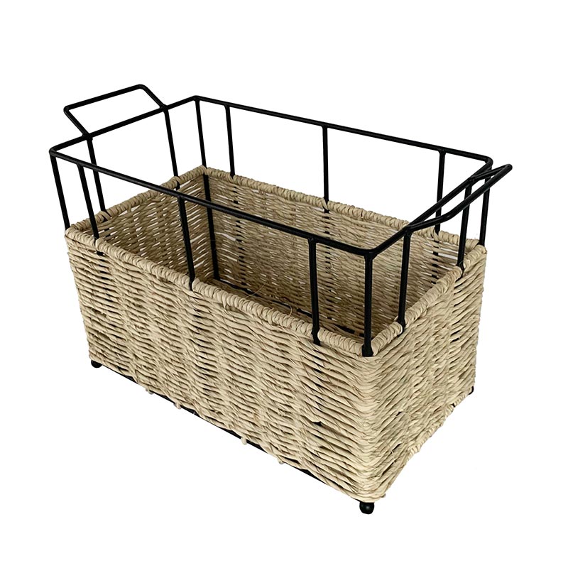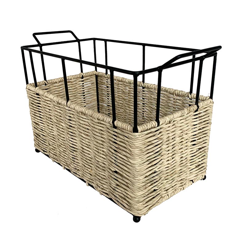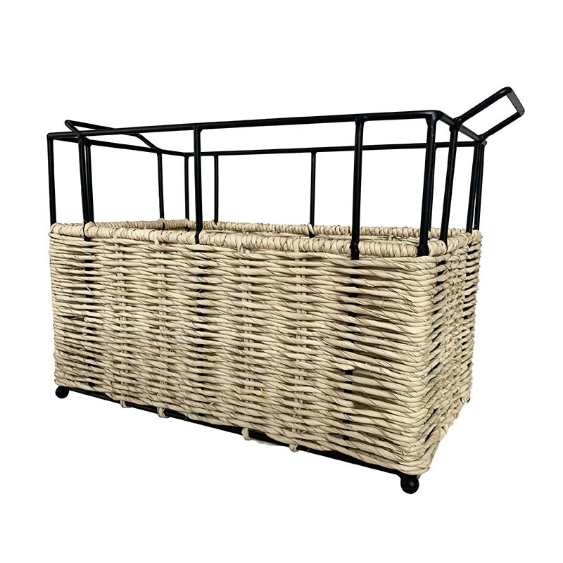 Cesto rectangular de herrería con asas y detalle tejido de palma natural.